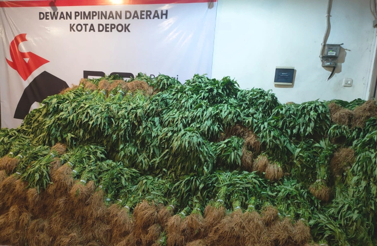 Pengiriman kangkung diterima pada dini hari oleh jajaran pengurus DPD PSI Kota Depok bersama perwakilan pengurus Dewan Pimpinan Cabang (DPC) PSI se-Kota Depok di Kantor DPD PSI Kota Depok, Jalan Cinere Raya Blok D No. 7, Cinere, Kota Depok.